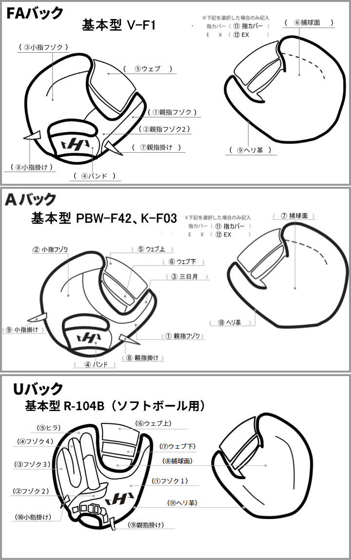 [すべてのグラブ、ミットのハミダシ部の色彩はグラブ本体と同系色で目立たないもの、もしくは皮の自然色とする。
