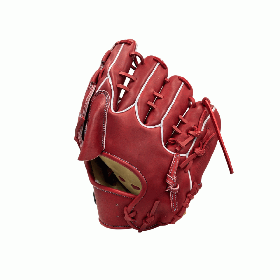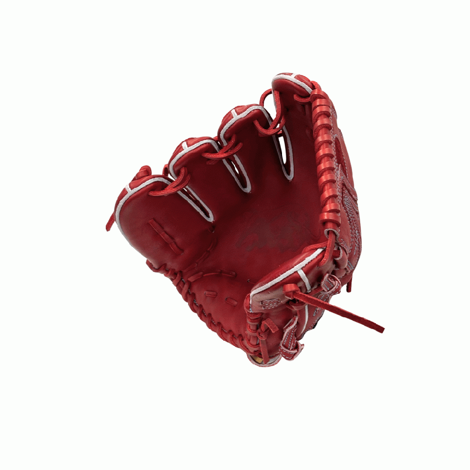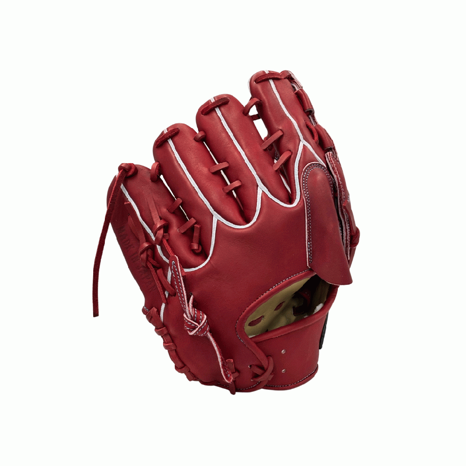 ![]() 【このグラブの大きさの目安】 ●赤線は土手部中央から人差し指先端までの長さを示しております。(1インチ=2.54センチ) ※天然皮革のため、革の伸び等で多少誤差が生じる場合もございます。 |