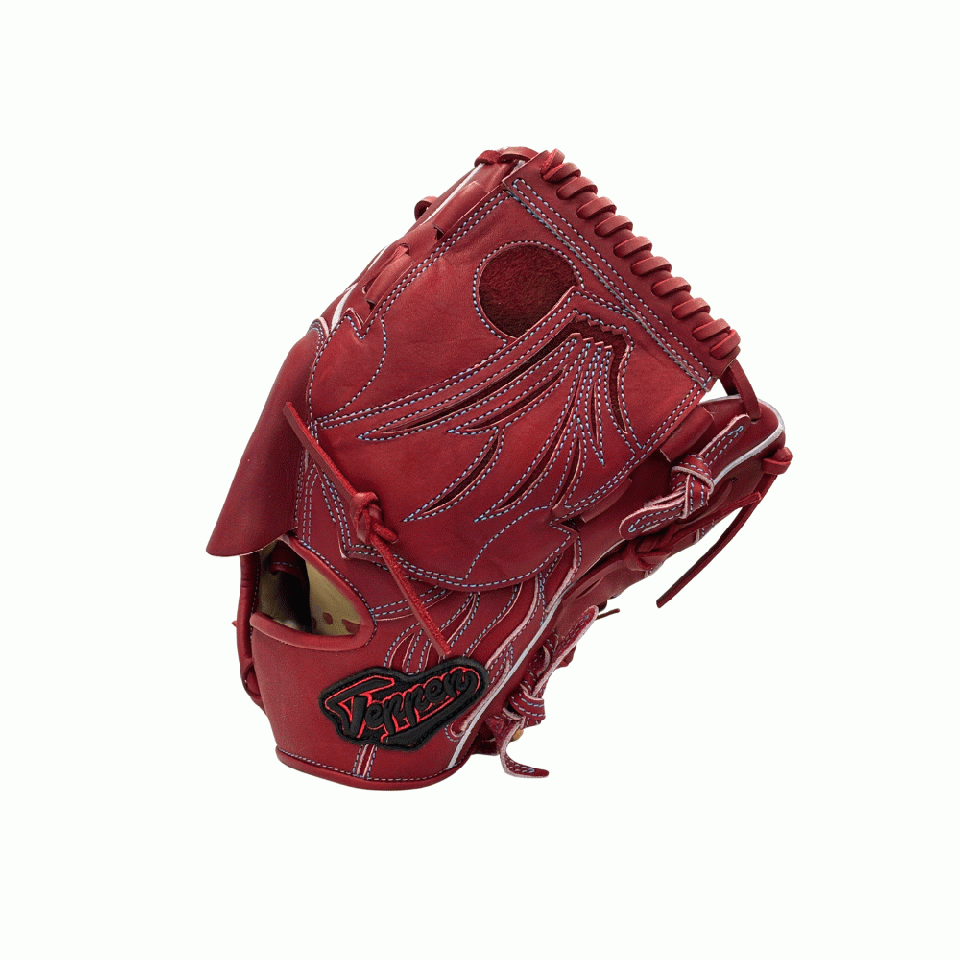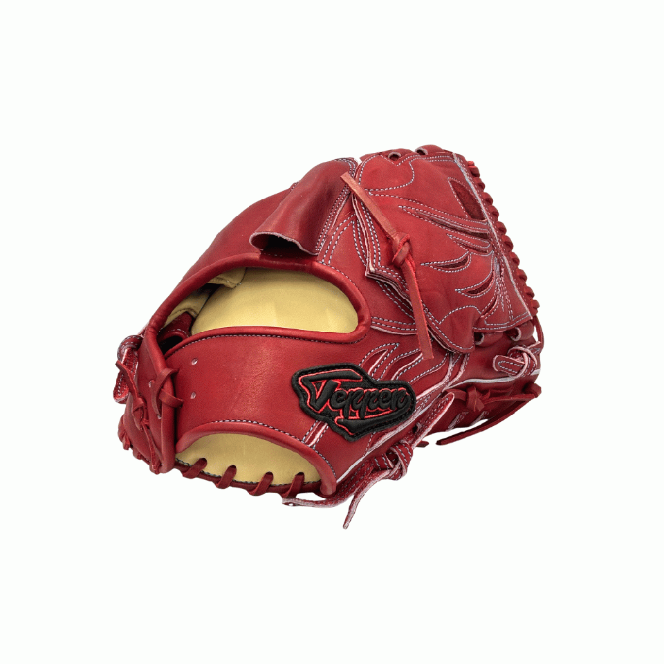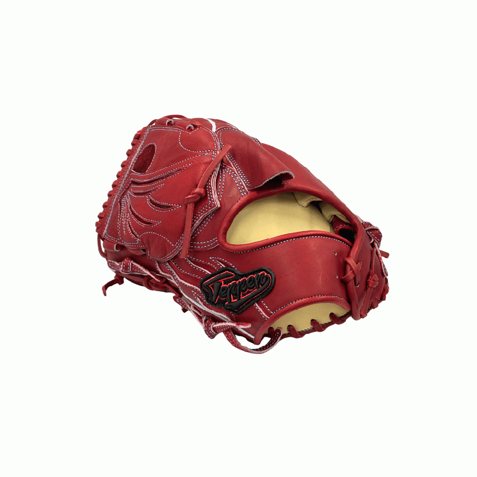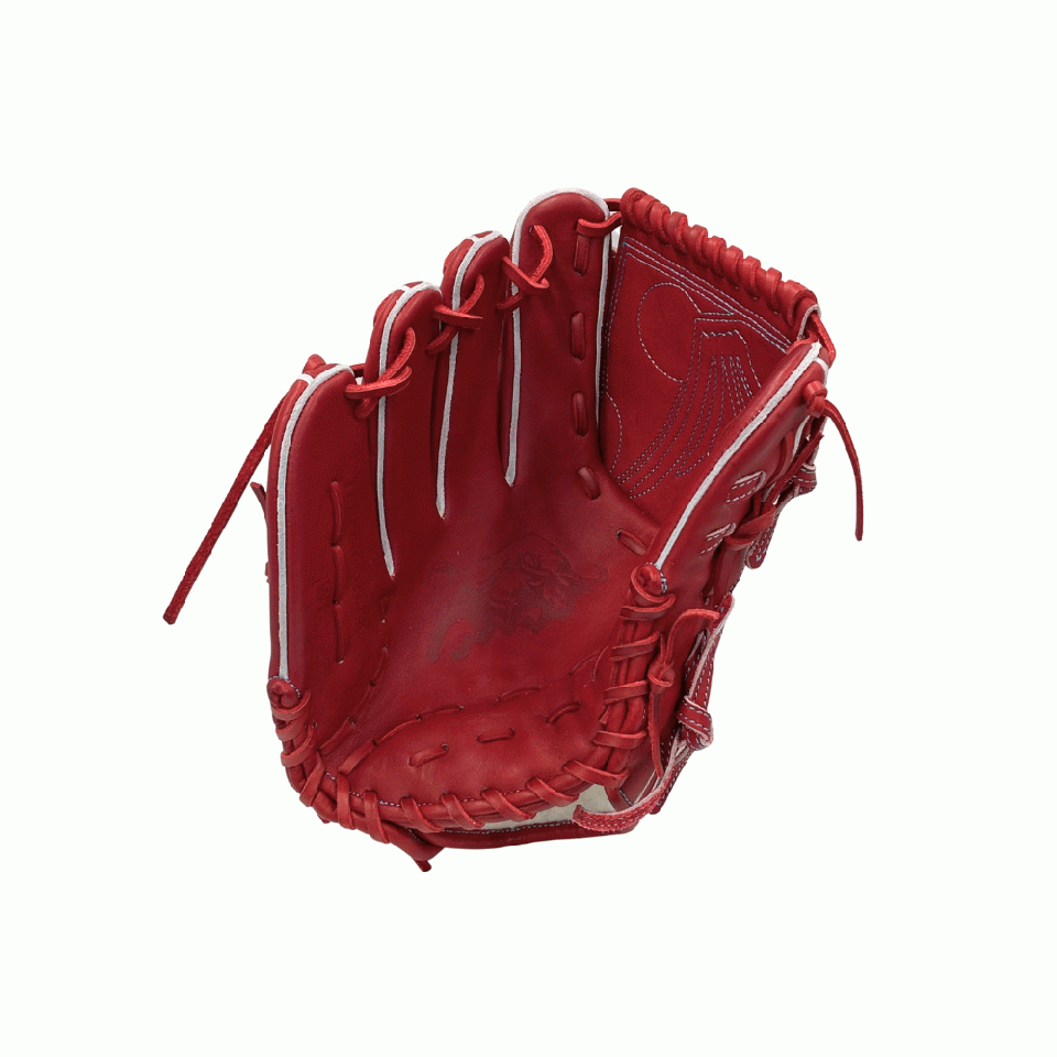 ![]() 【このグラブの大きさの目安】 ●赤線は土手部中央から人差し指先端までの長さを示しております。(1インチ=2.54センチ) ※天然皮革のため、革の伸び等で多少誤差が生じる場合もございます。 |