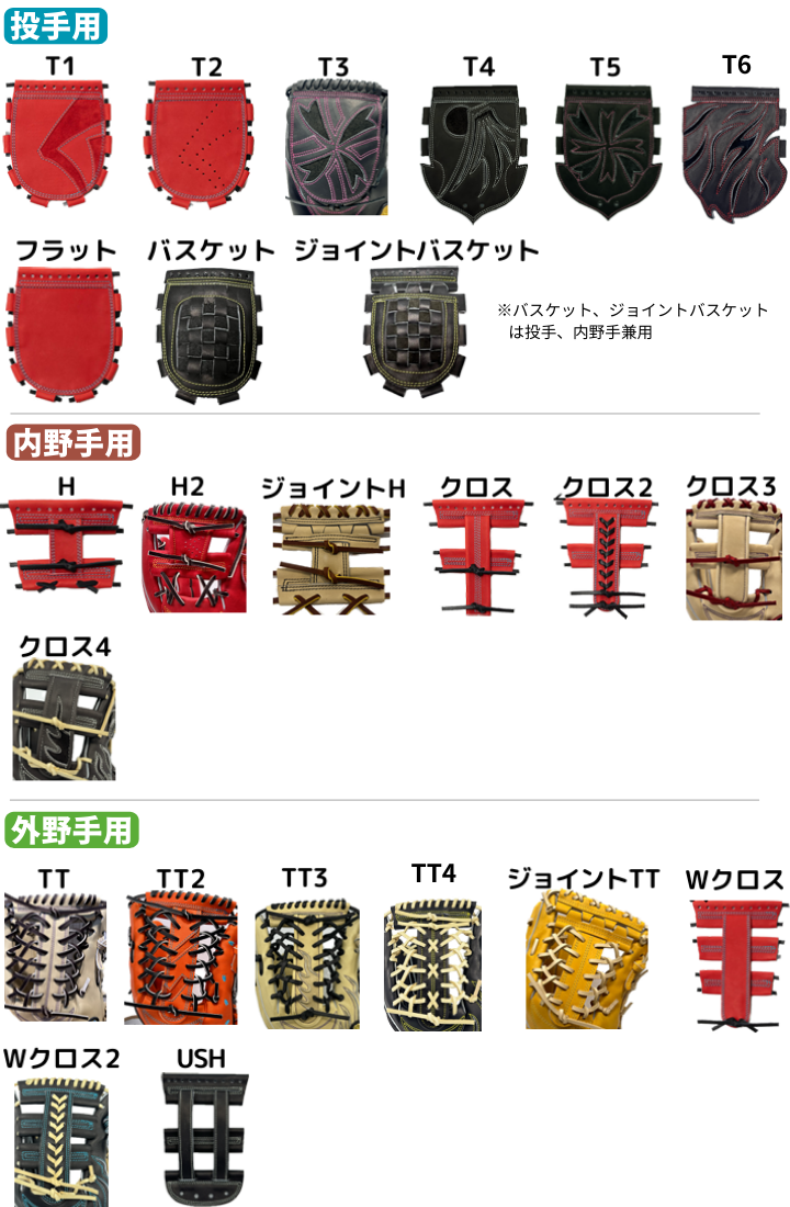 ※投手以外のグラブで本体と異なる色の革紐をつける場合は、ブラック、ブラック中白、タン、ブラウン、ブラウン中白、ブロンドに限られます。