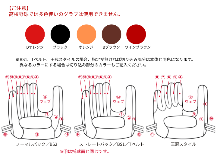 [すべてのグラブ、ミットのハミダシ部の色彩はグラブ本体と同系色で目立たないもの、もしくは皮の自然色とする。